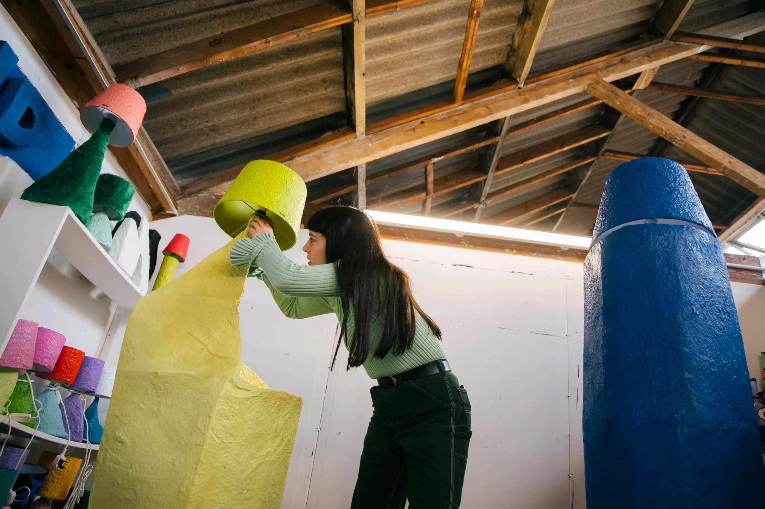 Papier-mâché is her go-to. It’s fast, forgiving, and found everywhere which makes it ideal for someone who works across countries and residencies. “I like materials to be accessible and malleable,” she says. “I can think of something I want to make and then a couple of days later it exists.”
